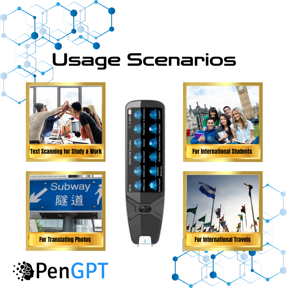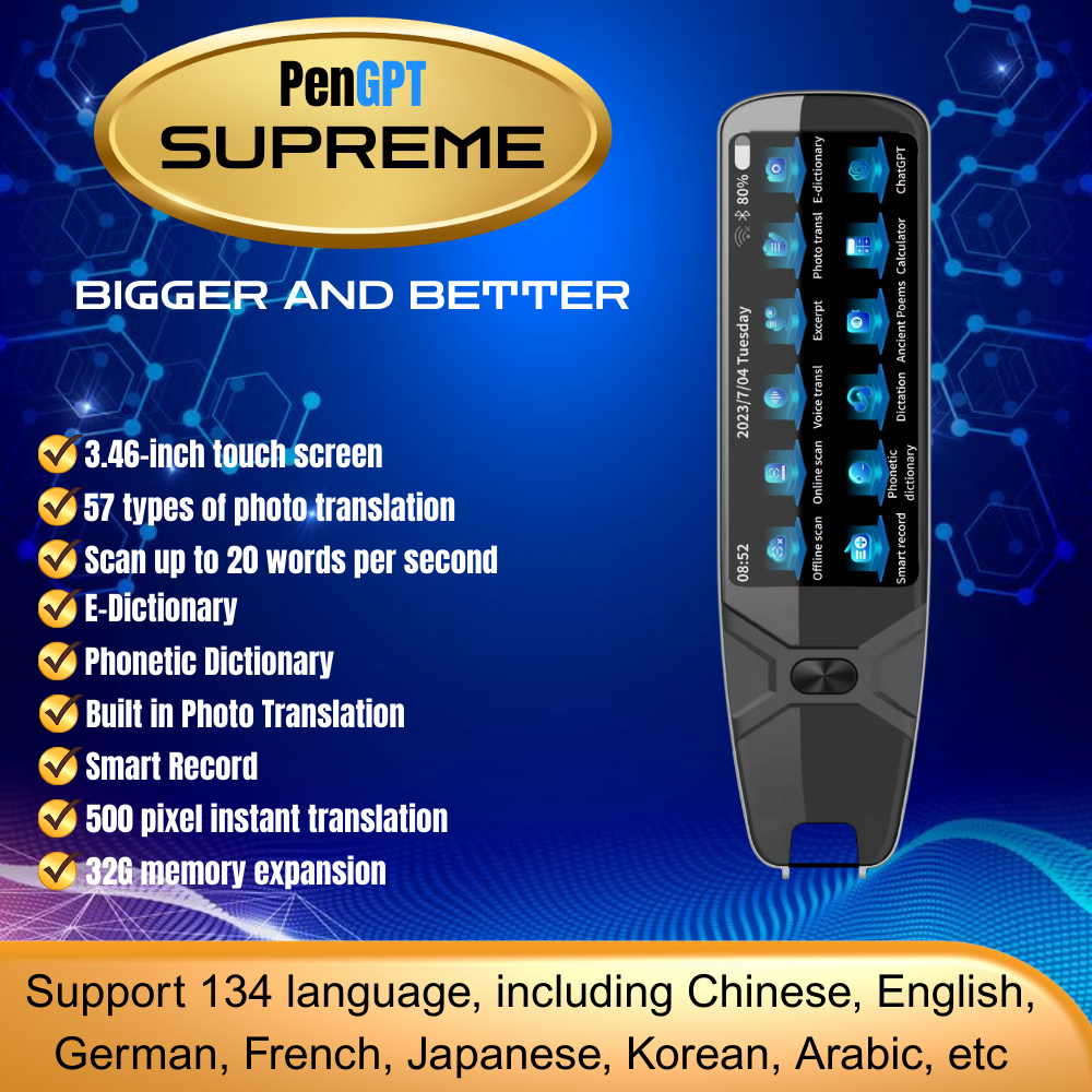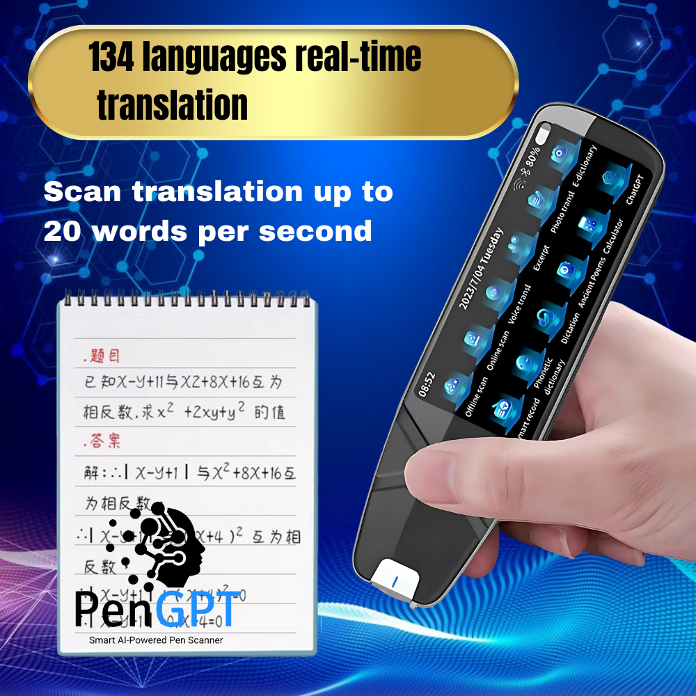 The PenGPTs are smart devices that instantly answers questions using the Built In ChatGPT System inside it, translates languages in real time, and scans text. It has a large HD screen, Wi-Fi, offline translation for 60+ languages, a built-in camera, Bluetooth, music playback, file storage, and voice recording.